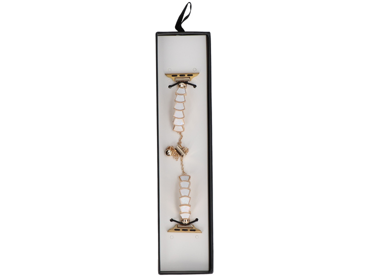 Pulsera GlacierX dedicada para Apple Watch 38/40/41mm, en estilo de manguito. Cierre deslizante de presión, hecha de eslabones con relleno tipo masa perlada, color dorado-blanco.