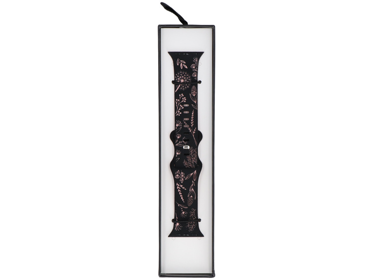 Correa de silicona GlacierX, dedicada para Apple Watch 38/40/41mm, con cierre deslizante con pasador. Negra con un diseño floral rosa.