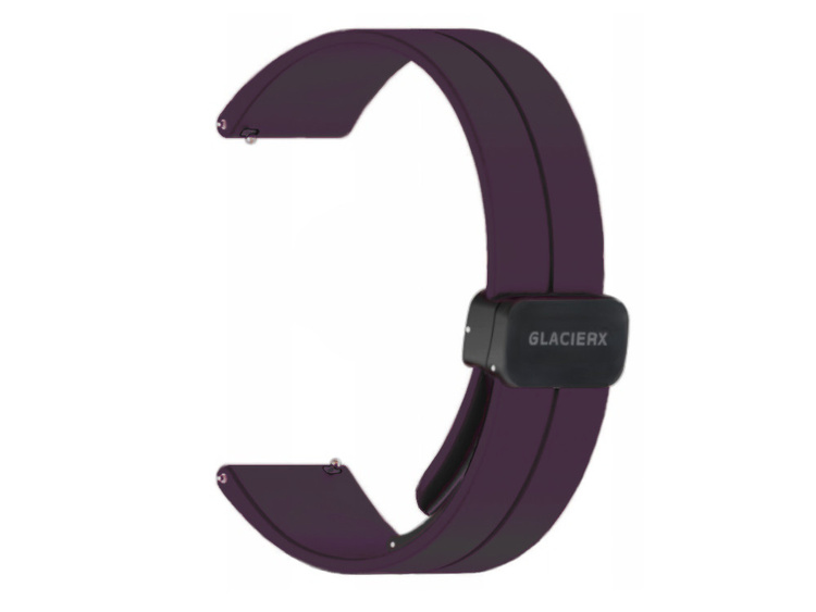 Correa de silicona para smartwatch GlacierX en color púrpura oscuro. El cierre magnético y plegable crea un lazo continuo con el reloj, asegurándolo contra deslizamientos accidentales de la muñeca. Producto nuevo, ancho de 22 mm.
