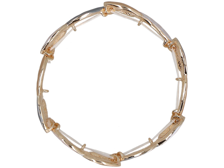 Un bracelet élastique en couleur or, composé d'éléments en forme de feuilles de différentes tailles. Délicat et plein de charme, il constitue une touche colorée subtile qui complétera harmonieusement à la fois des tenues quotidiennes et des styles plus él