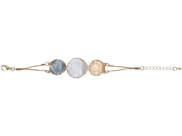 Bracelet élégante dans des teintes dorées et grises, ornée de trois éléments irréguliers spectaculaires dans un cadre rappelant des bijoux artistiques façonnés à la main. Fermée par une double chaîne avec réglage pour un ajustement parfait.