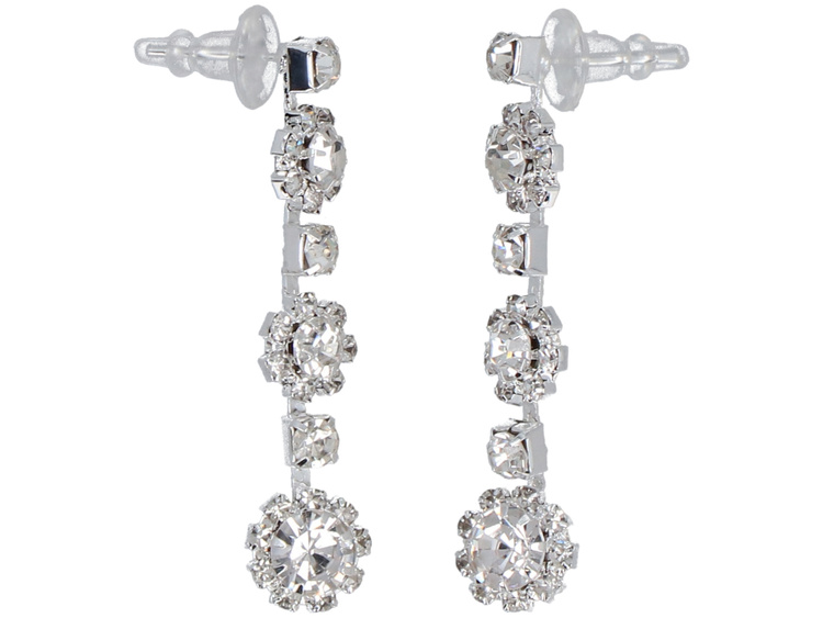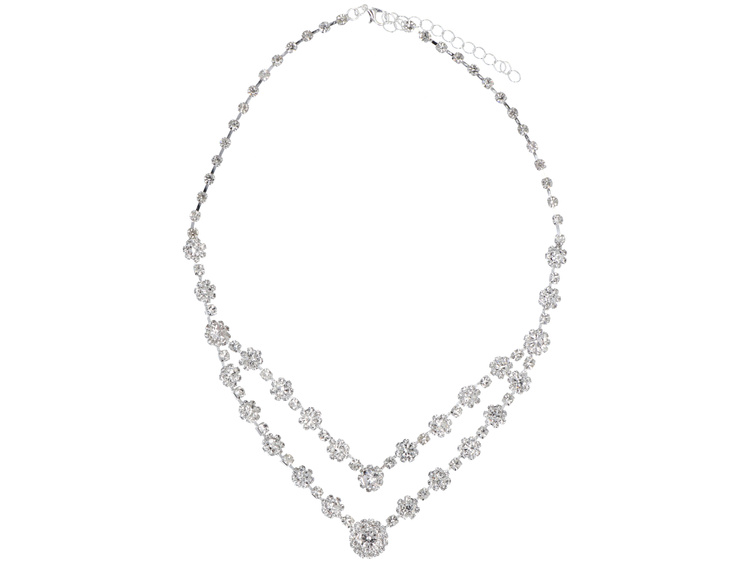 Ensemble de bijoux en couleur argentée. Collier à forme superposée et boucles d'oreilles à clou, ornées de brillantes zircones disposées en rosettes rappelant de petites fleurs. Un ensemble qui apporte une élégance romantique à la tenue.