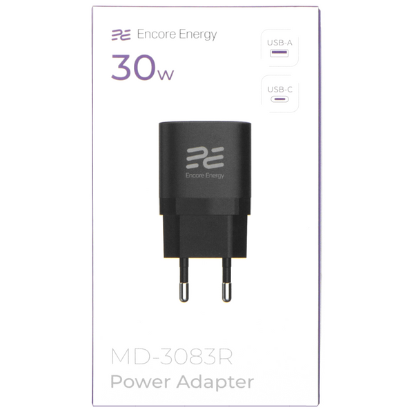 Adaptateur secteur Encore Energy à double port USB-A USB-C, pour charger différents appareils. Prend en charge les technologies de charge rapide: PD 3.0, QC 2.0 3.0 4.0, BC 1.2, AFC, FCP, Apple 5V/2.4A. Puissance maximale 30W.