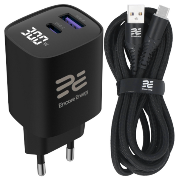 Nouveau chargeur secteur Encore Energy GaN QC 4 PD 3.0 USB-A USB-C 30W GaN-3083R avec écran + câble USB-A USB-C 2m