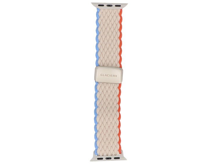 Ceinture tressée GlacierX, dédiée à l'Apple Watch 38/40/41mm. Grâce à la fermeture magnétique et à la haute flexibilité de la ceinture, il est possible de l'ajuster précisément au poignet. Produit neuf, couleur crème avec bord orange et bleu.