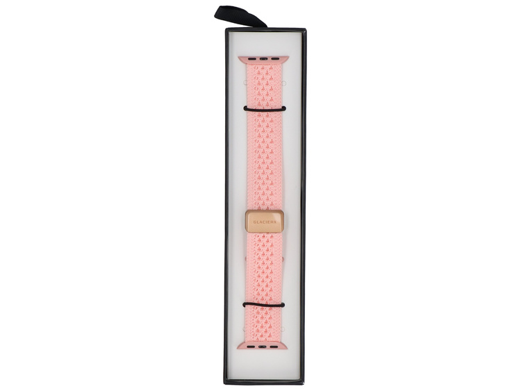 Ceinture en nylon GlacierX, dédiée à l'Apple Watch 38/40/41mm. Grâce à la fermeture magnétique et coulissante, elle permet un ajustement précis au poignet. Produit neuf, couleur rose avec texture décorative.