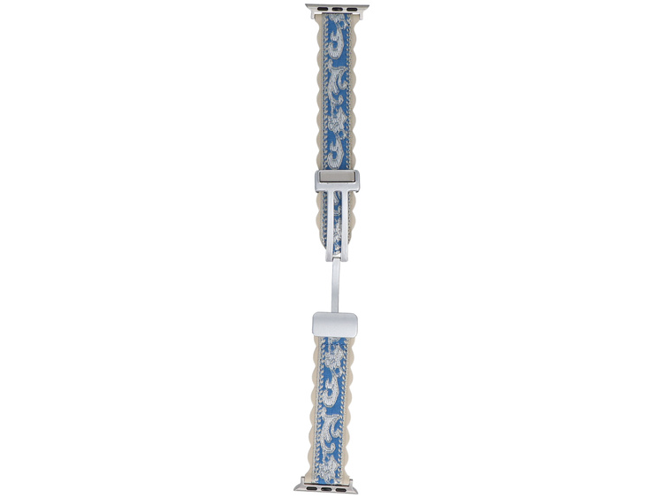 Ceinture en cuir et textile GlacierX dédiée à l'Apple Watch 38/40/41mm. Bimatière, avec un motif décoratif brodé en bleu et blanc.