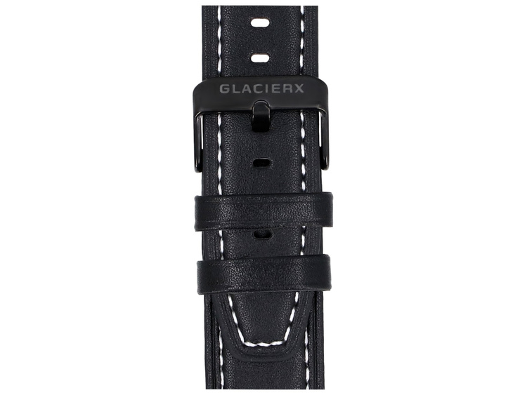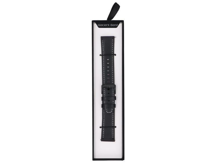 Bracelet pour smartwatch GlacierX en cuir synthétique de couleur noire, avec des coutures contrastantes claires. Produit neuf, emballé dans son emballage d'origine. Largeur de 22 mm, se ferme avec une boucle classique.