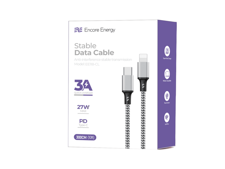 Nuovo cavo Encore Energy USB-C Lightning 3A cavo QC PD 27W per la ricarica e il trasferimento dati 300 cm intrecciato bianco e nero EE118-CL