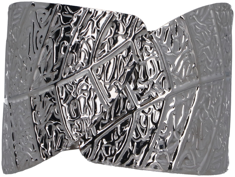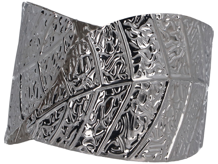 Botanica - ampia bracciale di colore argento, realizzata con segmenti testurizzati che creano un efficace motivo geometrico a foglia. La superficie del bracciale ha una struttura artistica e ruvida.