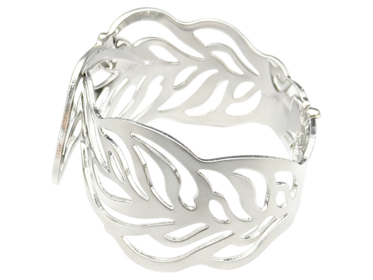 Creazione – modello a polsino con forma irregolare e artistica. La sua struttura rigida e aperta attira l'attenzione con un design audace, mentre la delicata struttura traforata le conferisce leggerezza ed eleganza. Colore argento.