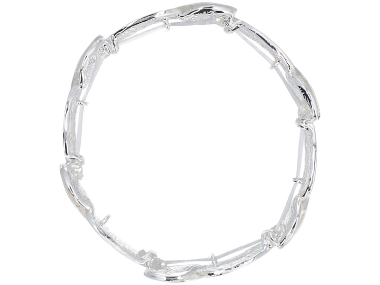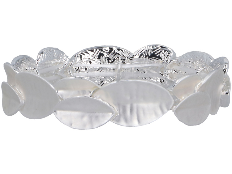 Bracciale elastica di colore argento-bianco, con elementi a forma di foglie di diverse dimensioni. Delicata e piena di fascino, rappresenta un accento cromatico sottile che completa armoniosamente sia le stilizzazioni quotidiane che quelle più eleganti.