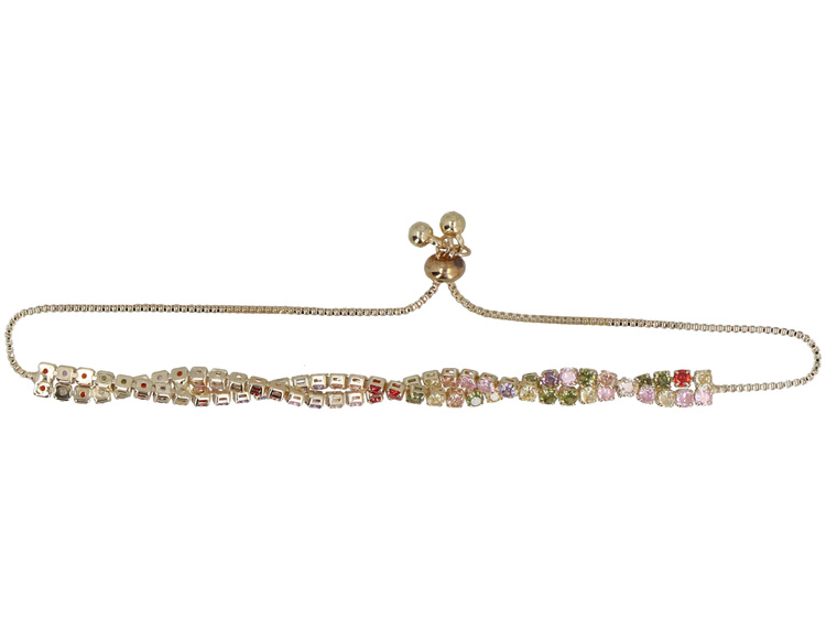 Gioia - bracciale delicata e piena di energia positiva, in colore oro, decorata con zirconie multicolori. La chiusura regolabile a scorrimento assicura una vestibilità perfetta al polso.