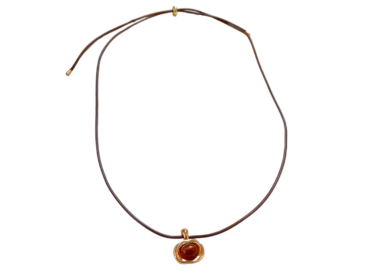 Tenerezza – collana minimalista con ciondolo oro-bronzo su un cordino marrone cerato. La sua forma interessante e la palette di colori naturali creano una composizione che emana calma e armonia.