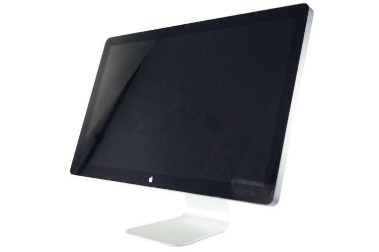 Monitor Apple Thunderbolt usato con un display WQHD. Monitor da 27 pollici. Il monitor presenta un vetro danneggiato al di fuori dell'area di lavoro, macchie bianche sul display e isolamento danneggiato del cavo Thunderbolt.