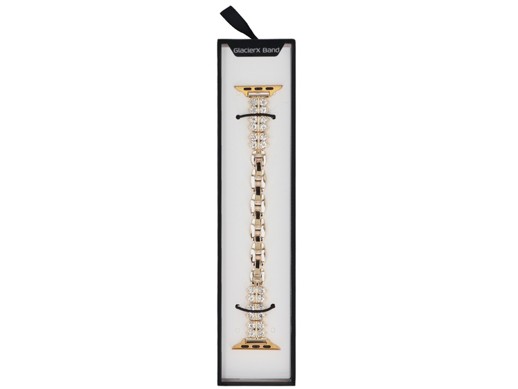 Braccialetto a catena GlacierX dedicato per Apple Watch 38/40/41mm. Colore oro, decorato con zirconi. Lunghezza regolabile tramite quattro maglie apribili. Prodotto nuovo, confezionato nella confezione originale.