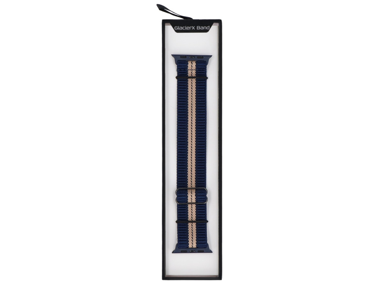 Cintura in nylon GlacierX, dedicata per Apple Watch 42/44/45/49mm. Grande elasticità e il regolatore applicato consentono un'adeguata regolazione della cintura al polso. Prodotto nuovo, colore blu scuro con inserti beige Ocean Blue.