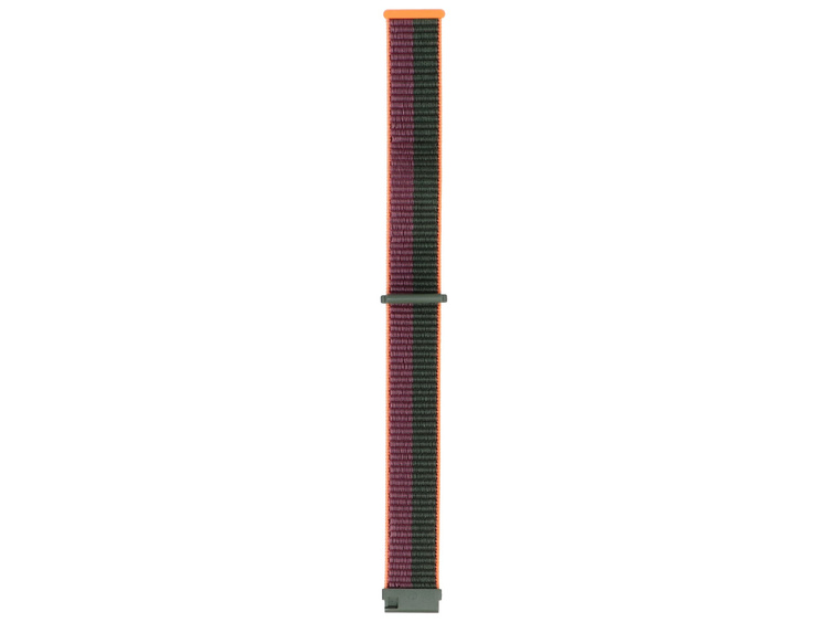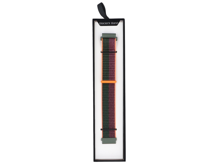 Cinturino in nylon per smartwatch GlacierX in tonalità scure di verde e viola, con finitura arancione a contrasto. Prodotto nuovo, imballato nella confezione originale. Larghezza 22 mm, chiusura a velcro.