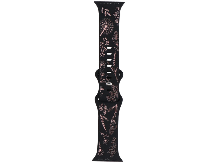 Cinturino in silicone GlacierX, dedicato ad Apple Watch 38/40/41mm, con chiusura a scorrimento con perno. Nero con motivo floreale rosa.