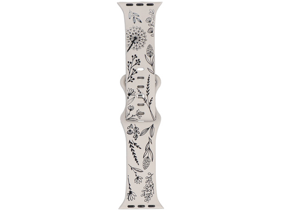 Cinturino in silicone GlacierX, dedicato a Apple Watch 38/40/41mm, con chiusura a scorrimento con perno. Colore bianco sporco con motivo floreale nero.