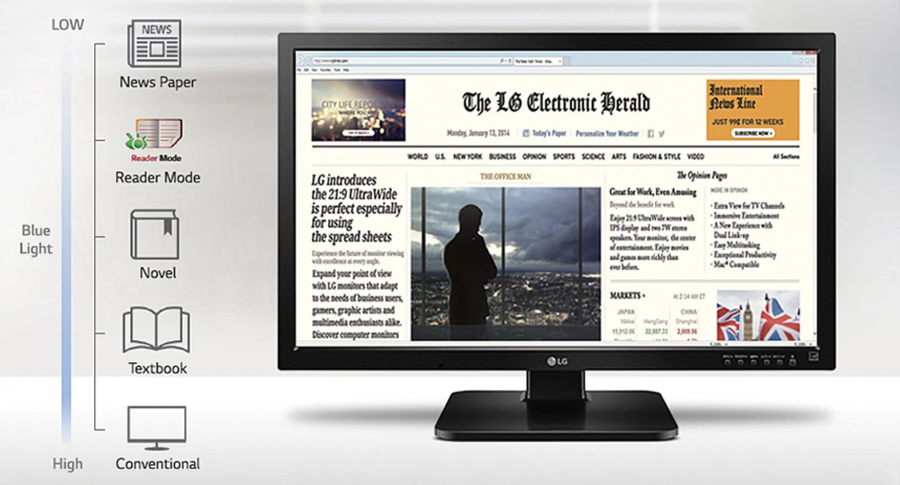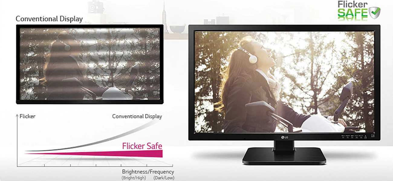 LG został wzbogacony o funkcję specjalnie przeznaczoną dla Twoich oczu. Flicker Safe ogranicza migotanie w trosce o zmęczone oczy. Już nigdy więcej tego efektu. Praca z nim ma być czystą i komfortową przyjemnością. Pracuj, graj, oglądaj, czytaj bez efektu przemęczenia wzroku. Tryb czytania redukuje emisje szkodliwego światła niebieskiego, obraz staje się przyjemnie ciepły dla oka tym samym zapewnia odpowiednie warunki do czytania w trosce o Twoje oczy!