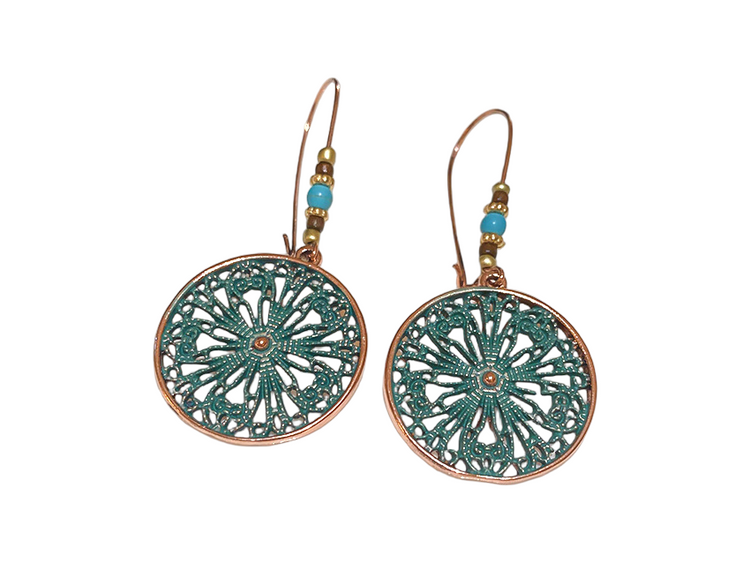 Етно – серйги, прикрашені кольоровими намистинами, з ажурним, східним візерунком, замкнутим у середині кола. Поєднання мідних і блакитно-зелених кольорів додатково підкреслює їх етнічний характер.