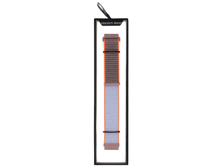 Нейлоновий ремінець для смарт-годинника GlacierX кольору коричнево-синьо-сірого, з контрастними помаранчевими краями. Продукт новий, упакований в оригінальну упаковку. Ширина 22 мм, застібається на липучку.