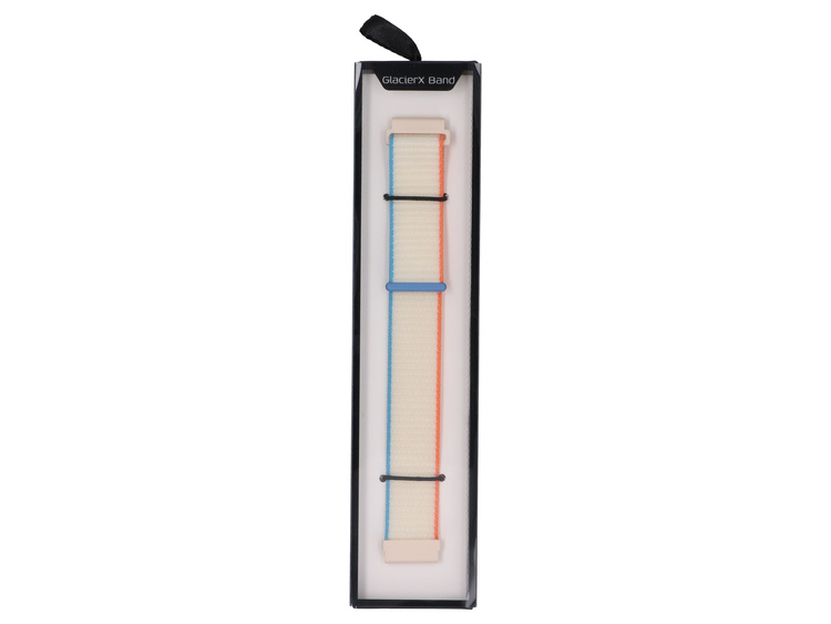 Нейлоновий ремінець для смарт-годинника GlacierX кольору зламаного білого, з контрастними краями синього та помаранчевого кольорів. Продукт новий, упакований в оригінальну упаковку. Ширина 22 мм, застібається на липучку.