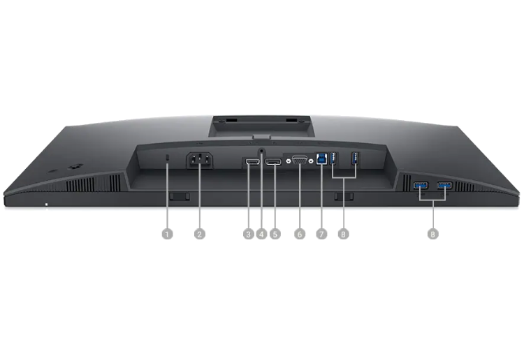 1. Gniazdo blokady | 2. Złącze zasilania | 3. Port HDMI | 4. Blokada podstawy | 5. DisplayPort | 6. Złącze VGA | 7. Superszybki port USB 5 Gb/s typu upstream | 8. Superszybki port USB 5 Gb/s typu downstream